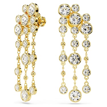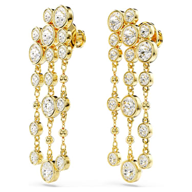 Dramatic and dazzling, these wondrous pierced earrings were designed to make a statement. Each gold-tone plated piece features a hanging design of metal droplets and round-cut crystals in a puffy bezel setting. With such a captivating array of sizes and facets on display, this pair is a perfect way to infuse your look with radiance.