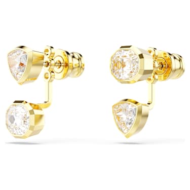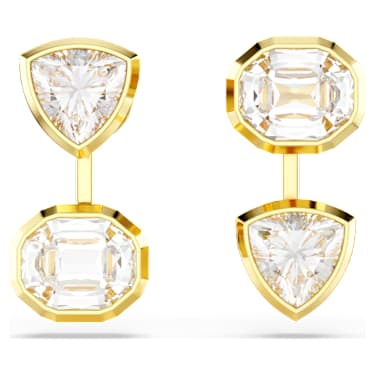 Combining geometry with light, these intriguing statement earrings are gold-tone plated, and feature a pair of trillion- and octagon-cut Zirconia on each jacket. The clear stones are placed in a modern bezel setting, and for a dose of asymmetrical style, their position is reversed on either side. Wear these earrings with a matching necklace and let your everyday style shine.