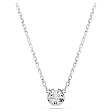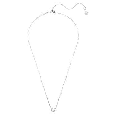 Effortless elegance is within reach thanks to this radiant Imber pendant. Suspended from a delicate chain with a lobster closure, the rhodium plated design features a central round-cut crystal in a puffy bezel setting. A single Zirconia is also placed in the elongation for added radiance. Wear this piece to elevate your everyday style.