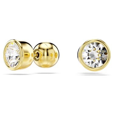 These simple pierced studs are a beautiful display of expert faceting. Each gold-tone plated piece features a round-cut crystal in a puffy bezel setting. A super everyday choice that can easily be paired with a bracelet or necklace from the Imber family.