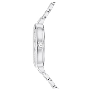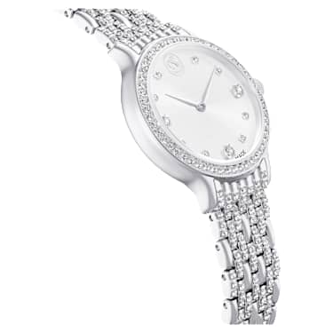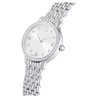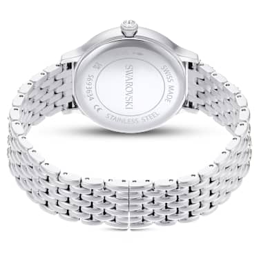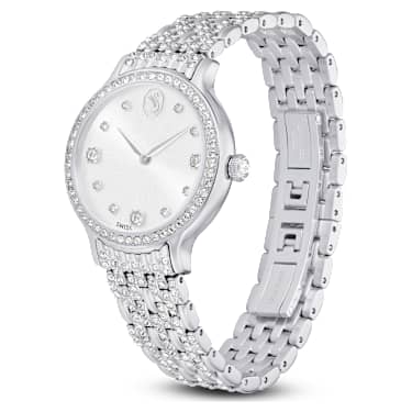 Adorned with 232 individual crystals, this glistening Imber watch is finest expression of timeless elegance. The 31mm stainless steel design features a pavé bezel set with 52 clear crystals, while one additional crystal is also placed within the crown. On the sunray dial, 11 crystals in small and large sizes are used to mark the hours, along with a swan logo at 12 o’clock. Around the wrist, the watch’s most distinctive feature is the adjustable seven-link bracelet, which is stunningly set with 168 round-cut crystals. This Swiss Made watch is water resistant to 50 meters and matches seamlessly with selection of Imber jewelry.