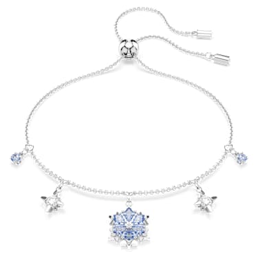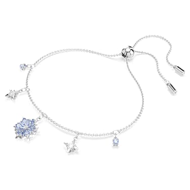 This bracelet beautifully captures the snowflake in brilliantly faceted style. The rhodium plated design is embellished with blue Zirconia, which forms five wintry motifs on a delicate chain with an adjustable sliding closure. A beautiful addition to your jewelry collection or the perfect gift.