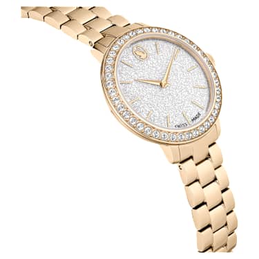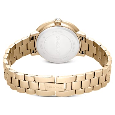 Inspired by Matrix jewelry, this 30mm timepiece captures the same sense of contemporary and expressive styling. The stainless steel design is champagne gold-tone finished and features a pavé bezel set with 42 crystals. The beautifully round dial is given a glitter effect and includes slender hour markers and hands, as well as a swan logo at 12 o’clock. Along with an additional crystal set within the crown, this watch is notable for its three-link bracelet, which glides elegantly around the wrist. The Swiss Made timepiece is water resistant to 50m and is the perfect companion for any occasion.