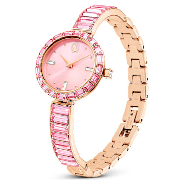 Elegance is amplified with crystals in this beautiful jewelry-inspired timepiece. The 25mm stainless steel design has a rose gold-tone finish and is encircled by a bezel with 20 baguette-cut pink crystals, while a single crystal is set within the crown. Baguette-cut crystals also highlight three index markers on the pink dial, which also features a swan logo at 12 o’clock. Around the wrist, the bangle-style bracelet is adorned with 16 baguette-cut crystals and is fully adjustable for a comfortable fit. The Swiss made watch is water resistant to 50 meters and is the ideal accessory to illuminate every facet of life.