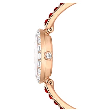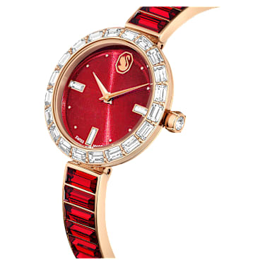 Elegance is amplified with crystals in this beautiful jewelry-inspired timepiece. The 25-mm stainless steel design has a rose gold-tone finish and is encircled by a bezel with 20 baguette-cut clear crystals, while a single crystal is set within the crown. Baguette-cut crystals highlight three index markers on the red dial, which also features a swan logo at 12 o’clock. Around the wrist, the bangle-style bracelet is adorned with 16 baguette-cut red crystals and is fully adjustable for a comfortable fit. The Swiss made watch is water resistant to 50 m and is the ideal accessory for a special occasion.