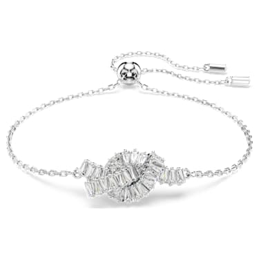 This woven bracelet is a pure expression of light and unity. Featuring a chain with an adjustable sliding mechanism, the rhodium plated motif is inspired by a ribbon, and delivers a tied-up adornment of baguette-cut Zirconia. Delicate and elegant, it’s an artistic choice to wear alongside matching jewelry pieces from the same family.