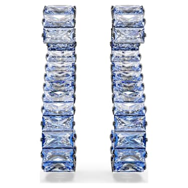In tribute to the name and our graceful swan silhouette, these S-shaped pierced earrings are infused with emblematic style. Each ruthenium plated piece is adorned in three shades of vibrant blue Zirconia, celebrating a signature color from the brand universe. Wear them as a joyful accessory to make any outfit pop.