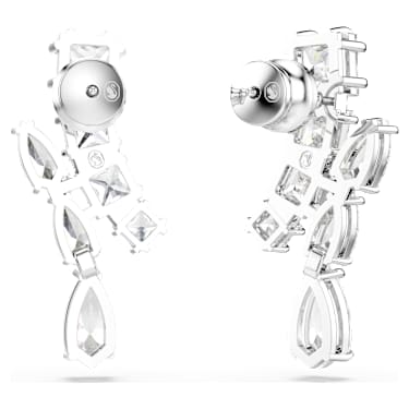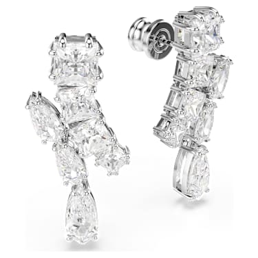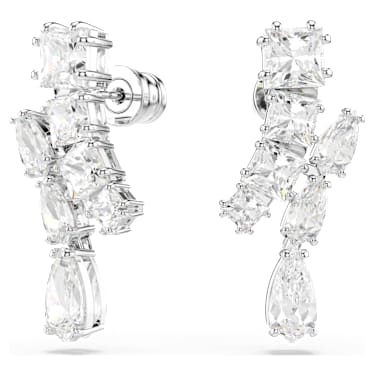 These dynamic pierced earrings shimmer with energetic radiance. Each piece is rhodium plated and adorned with a variety of prong-set Zirconia in different cuts. The standout suspended element ensures the light reflects from every angle. Pair this set with a matching Matrix pendant for elegant everyday styling.