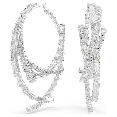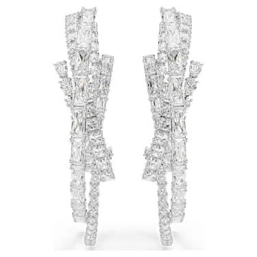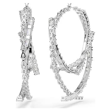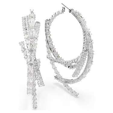Give your hoop style an extravagant upgrade with these head-turning earrings. Each bold piece is designed to make a statement and features different cuts of Zirconia, all set within a sleek and reflective rhodium plated finish. A captivating way to dial up your glamour, these earrings can be paired with a matching bangle or choker.