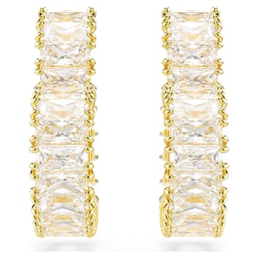Fall in love with these romantic heart-shaped pierced earrings. The design is gold-tone plated and features a full set of clear baguette-cut Zirconia. A modern and brilliant take on a classic hoop.