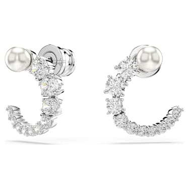 Every detail of these pierced earrings exudes beauty. Each rhodium plated stud features an open ring of clear Zirconia, ranging in size from small to large, and bookended with a white Crystal Pearl at the top. Pair with a matching Matrix pendant to own the spotlight.