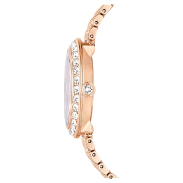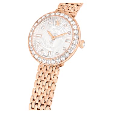 This Matrix watch seamlessly blends contemporary styling with signature savoir-faire. The round 30mm case is made with a beautiful rose gold-tone finish and features a bezel set with a pavé of 30 crystals. Beneath the mineral glass, a mesmerizing guilloché dial is revealed, with the swan logo at 12 o’clock, along with indexes created from round and baguette crystals. There is also a single crystal set in the watch’s crown. For style around the wrist, the watch is presented on a seven-link bracelet with a rose gold-tone finish. This Swiss made watch is water resistant to 50m and is designed to keep you on time for everyday occasions with exquisite sophistication.