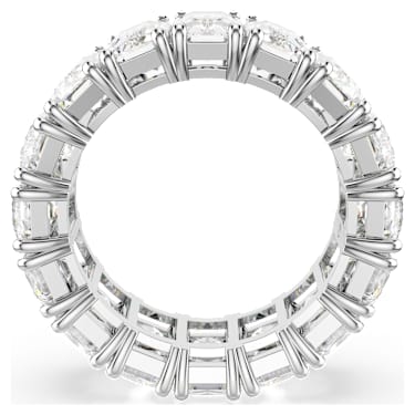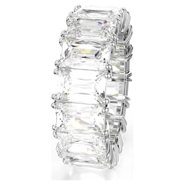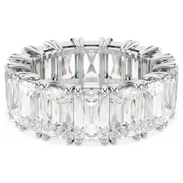 A striking, elegant look distinguishes this ring. A row of gleaming white stones, cut into a faceted, rectangular shape, lends it an air of refined simplicity. The unbroken line of sparkling stones defines the character of the design and matches well with equally elegant pieces of jewelry, especially other rings to create an attractive and on-trend stacking look. A great match for special occasions, and an inspired gift giving idea.