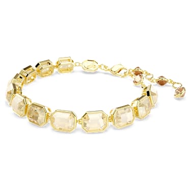 Be your brilliant best in this vivid Millenia bracelet. The gold-tone plated design features a strand of octagonal caramel crystals in a refined bezel setting. There is also a lobster closure with an elongation, allowing you to adjust the fit. Pair this bracelet with the matching necklace to elevate your everyday look.