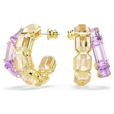 These multicolored earrings are the choice for all-out glamour. Each gold-tone plated piece features two asymmetrical mini hoops, with octagonal caramel crystals in a bezel setting, and purple crystals in a prong setting. A beautiful mix of contrasts that come together for one bold look. Wear these earrings alongside matching pieces from the same family to accentuate the effect.