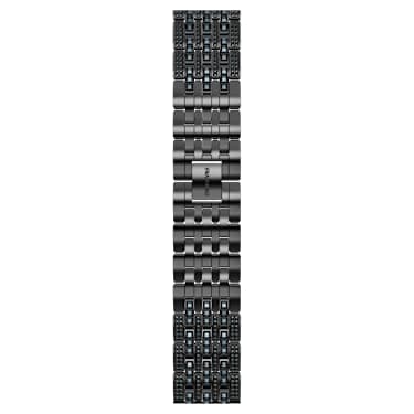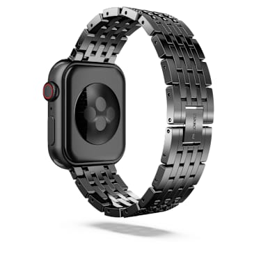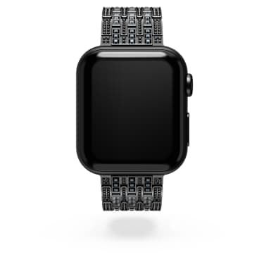 Keep time in style with this striking strap crafted for compatibility with Apple Watch®. The eye-catching design features PVD black tone, fully embellished with silver night crystals. Style with your jewelry. This strap suits Apple Watches® sized 40mm or 41mm, including Series 4 – 9 and SE. Apple Watch® is a trademark of Apple Inc. This product is delivered with a standard size bracelet and two additional links, enabling it to be made longer or shorter with the help of our instore staff.