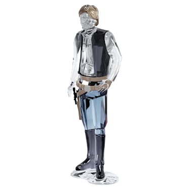 Blending craftsmanship with the Star Wars universe, the heroic smuggler Han Solo sparkles in brown, blue, gray and clear crystal, with red stripes printed on his pants. This unique design features 347 facets, as well as black and gray lacquered metal details. It combines perfectly with other pieces from the Star Wars collection. Decoration object. Not a toy. Not suitable for children under 15.
