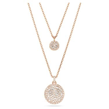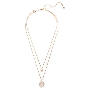 This shimmering layered pendant is the ideal way to fill your style with light. The rose gold-tone plated design features two chains, each with a domed meteor motif that is beautifully adorned with a snow pavé of clear round crystals in different sizes. For extra versatility, the pendant can be reversed, revealing a halo of crystals around the larger motif, and a single crystal at the center of the smaller motif. A wondrous gift for yourself or a loved one.