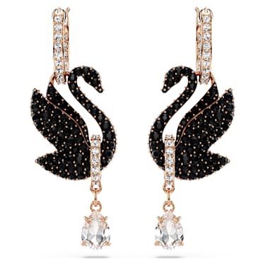 These light-catching earrings are a beautiful expression of the signature emblem. Connected to mini hoops, each rose gold-tone plated piece features an elegant swan motif, expertly decorated with a pavé of jet black ReCreated™ crystals. A clear, pear-cut Zirconia delicately hangs beneath from a rose gold-tone link. Wear these earrings to elevate your own style, or present them as a radiant gift to a loved one.
