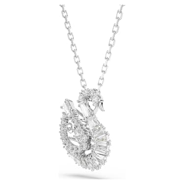 This pendant conveys the graceful movement of iconic swan. Suspended from a rhodium plated chain, the central motif reveals an elegant silhouette, adorned in Zirconia and with a clear dancing stone in a swan body cut. This radiant detail creates an endless motion of light, and will keep your style shining at every moment.