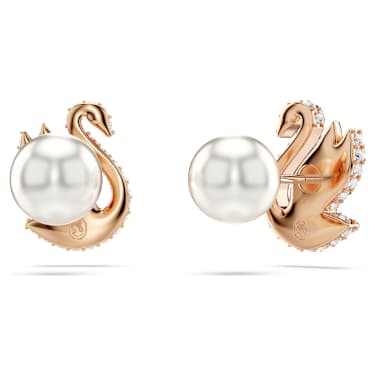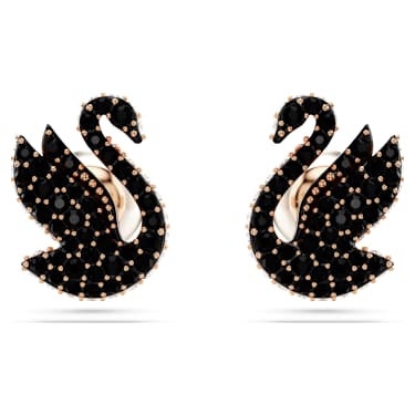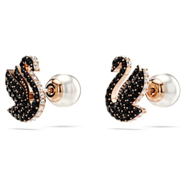 Inspired by the signature emblem of, these elegant earrings reveal a swan preparing to take flight. Each rose gold-tone plated piece features a single Crystal Pearl closure, along with a swan motif, expertly decorated with a pavé of jet black ReCreated™ crystals. These sophisticated earrings can be worn alone or paired with a matching pendant for maximum glamour.