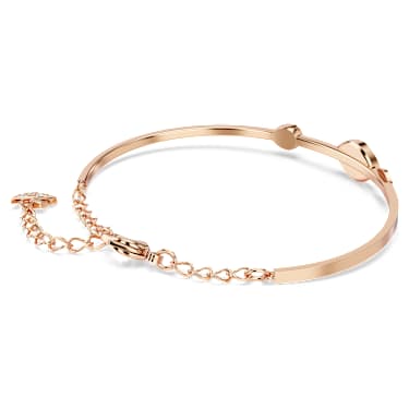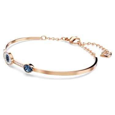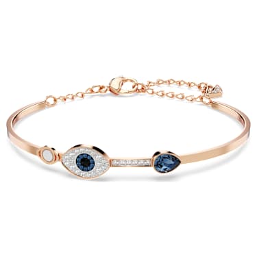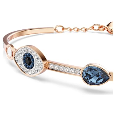This stunning mixed-plated bangle offers a striking contrast between rose gold-plated metal, crystal pavé, and blue crystals. Featuring two eye motifs and a blue crystal drop, it has an adjustable closure for a secure fit. Mix and match with other bangles for a trendy look.
