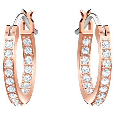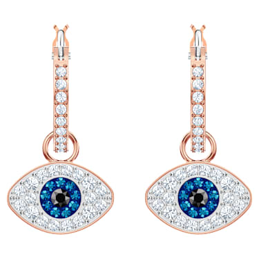 Dial up your fashion credentials with this versatile pair of hoop earrings in rose gold plating. A play on the classic evil eye symbol, they feature the protective talisman embellished in clear, blue, and black pavé. Hanging from classic clear pavé hoops, the eye motifs can be removed if desired. Certain to add a sense of cool and romantic glamour to even the most casual outfit.