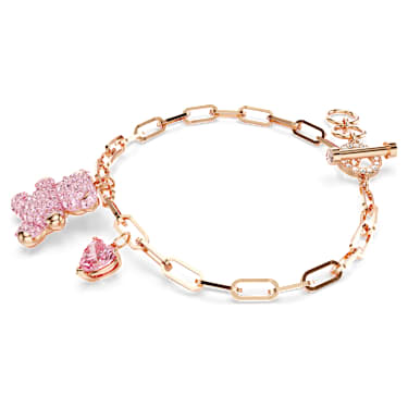 This rose gold-tone plated chain bracelet features a playful teddy bear motif embellished with pink crystal Pointiage®, and a heart-shaped charm in warm pink. Wear yours with the matching necklace to complete the set.