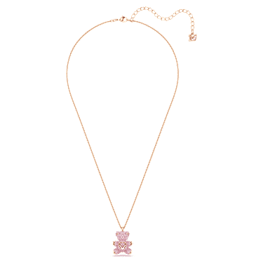 Inspire a smile with this playful pendant. The 3D teddy is covered in light pink crystal Pointiage® and holds a heart-shaped ‘dancing’ stone in a vibrant pink shade. Finished with a rose gold-tone plated chain, this unique design encapsulates luck and love.