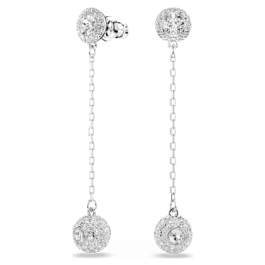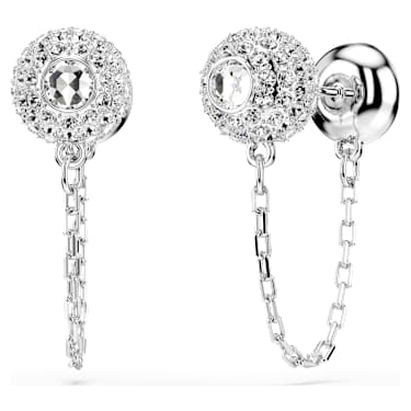 Radiate wonder with these shimmering earrings. Each rhodium-plated piece features a long chain connected to a double-sided motif, offering a different display of round-cut crystals on each side. The hanging motif can also be connected to the back of the stud for a versatile wearing option. Mix and match with other Una Angelic pieces for a look of ultimate radiance.