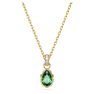 This shimmering pendant from the Chroma family is small yet powerfully beautiful. Like a droplet of light, the pendant features a pear-cut green centerstone in a gold-tone plated surround enhanced with square clear crystals around the edges and the bail. Beautifully attached to a gold-tone plated chain with a round stone detail at the end…