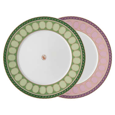 Create a feast of wonder with this pink and green plate set. Inspired by the Wiener Werkstätte art scene, the mesmerizing geometric motif features’s signature octagon with the iconic swan logo at the center in gold tone. Set the table with other colorful pieces from the Signum collection for maximum impact. This plate set is…