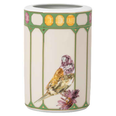 Celebrate nature in the most joyful way by displaying your flowers in this faceted vase. Using an exclusive technique, the green and marshmallow porcelain is printed with two motifs that capture the essence and radiance of crystals. This includes a lively cockatoo on one side, and a colorful finch on the other. Created in partnership…