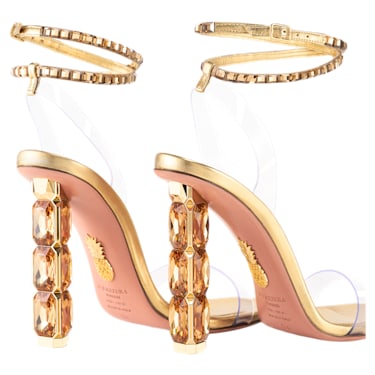 Defined by light-catching crystals and a Soft Gold colorway in laminated nappa leather and transparent plexi, the limited-release Aura sandal exudes the modern, vibrant elegance that Aquazzura is known for. Part of the Creators Lab, this handmade design dazzles with statement heels featuring octagonal gold-colored crystals and glittering ankle straps paved with square-cut stones. Prepare to turn heads wherever you walk.