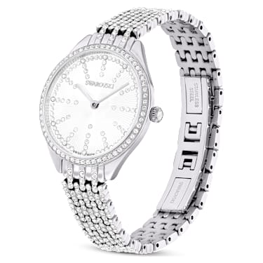 The simplicity of stainless steel has been beautifully lifted in this Swiss Made timepiece thanks to the compelling use of 433 crystals. On the silver tone guilloche dial, you’ll discover crystals for index markers, while the slender bezel and bracelet are each adorned with their own pavé of dazzling clear crystals. The 30mm watch is water-resistant to 50m and includes a single stone in its crown. The overall look is designed to make a subtle yet noticeable impact with any outfit you wear.