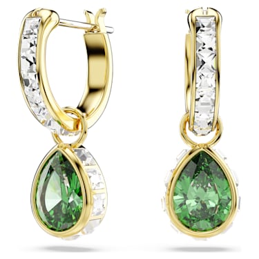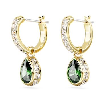 Even the most delicate pieces can be big on self-expression. These Chroma earrings will light up your look with a gold-tone plated design featuring mini hoops with clear square crystals, and a single pear-shaped Zirconia in green surrounded by clear square crystals. Its energizing emerald hue will add allure to any look.