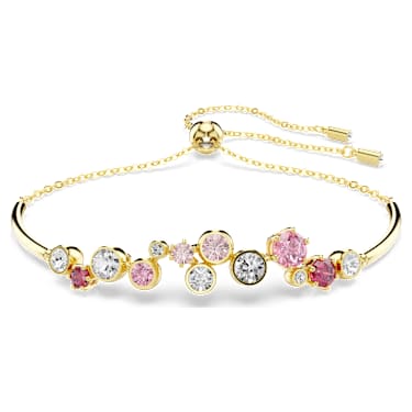 Let your playful side shine with this warm and joyful bracelet. The Constella design features a delicate chain and gold-tone plated bars, along with a vibrant display of crystals and Zirconia in various sizes. The vivid mix of clear tones and pink and red shades gives the bracelet a captivating appearance, while the sliding adjustment allows you to easily change the fit.
