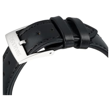 Expressing precision through sophistication, this Dextera chronograph is a bold and sporty choice within Swarovski’s timepiece collection. The 40 mm stainless steel case is seamlessly integrated with a metallic bezel that is printed with a black tachymeter scale, traditionally used to measure speed over distance. This provides a frame for the silver-tone sunray dial, which is displayed with a modern grid pattern, fluorescent hands and indexes, and three subdials, including a minutes counter, seconds counter, and hours counter. Around the wrist, this Swiss Made watch is worn on a black leather strap and includes a single crystal in the crown, as well as a water resistance of 50 m.