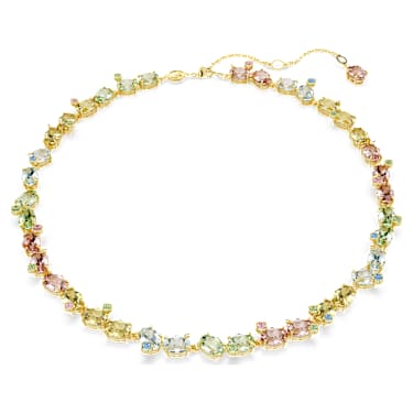 With bold color and shimmering reflections of light, this all-around Gema necklace makes a powerful statement of joy. The gold-tone plated design features a full surround of large crystals in multiple vibrant hues, accompanied by smaller crystals in a playful bubble prong setting. The effect is effervescent as well as energetic, giving you a mood-boosting piece of jewelry for your brightest days.