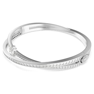 This twisting Hyperbola bangle is a design marvel. Featuring two overlapping rhodium plated bands, the piece is adorned with clear Zirconia in channel and prong settings. An additional oval-cut crystal is placed in between for added impact. Style this intricate jewelry with a minimalist outfit to showcase the beauty in contrast.