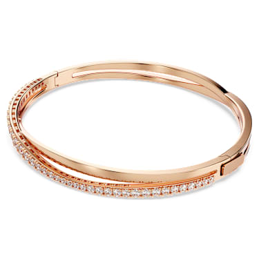 Stylish and refined, this rose-gold tone plated bangle complements everyday looks with its brilliant touch of timeless elegance. Featuring one sinuous line of polished metal curving around another embellished with radiant, white stones, it’s a modern interpretation of classic luxury. A lovely gift idea.