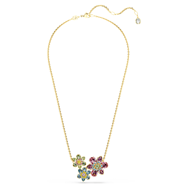 Showcasing a bright bouquet of three flowers, this stunning pendant will bring peace and nature into your style. Suspended from a gold-tone plated chain, the central motif is adorned in crystals of different shapes and colors, creating an overall effect of mood-boosting joy. A wondrous piece to wear on its own or paired with a matching Idyllia ring.