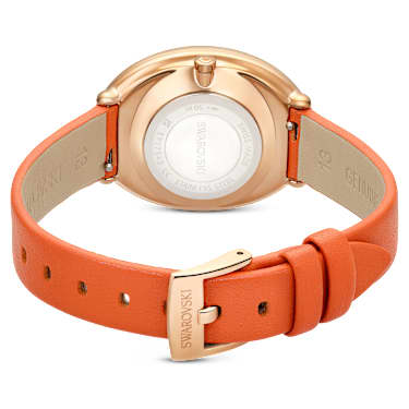 The Imber timepiece conveys a modern approach to watchmaking through its glittering dial and timeless elliptical shape. This 24 x 26.3 mm stainless steel version is rose gold-tone finished and features around 1000 clear crystals on its Crystalline dial. Amongst the slender hour markers, a single Roman numeral is displayed at 6 o’clock, while Swarovski’s iconic swan is placed at 12 o’clock. The Swiss Made watch is worn on a sleek leather strap in orange and offers a water resistance of 50m. Make this your go-to choice for sophisticated day-to-night styling.