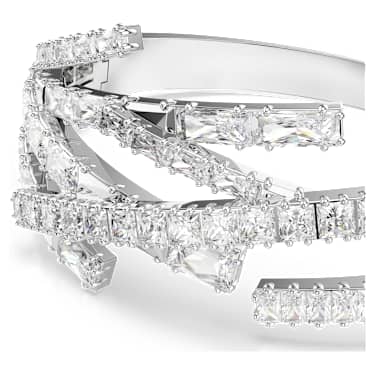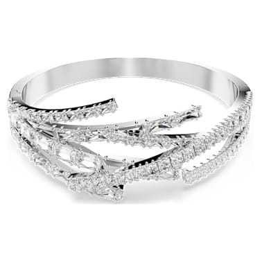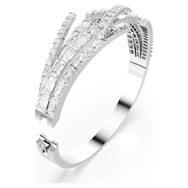 Wrap your wrist in captivating style with this multifaceted bangle. The sleek and modern design is rhodium plated and features a side closure for a comfortable and secure fit. To create a look of scintillating radiance, the bangle is adorned in strands of clear Zirconia, each catching the light with every movement. Wear this jewelry with the matching choker and earrings for a look of pure glamour.