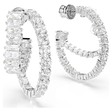 Infused with the symbol of love, these pierced Matrix earrings are radiant and romantic. Each rhodium plated hoop features an open heart-shape in the middle, with a full adornment of baguette-cut Zirconia in a clear hue. An exquisite choice for self-expression that will fill your style with light.