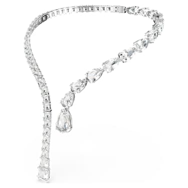 With its elegant curves and all-around radiance, this Matrix necklace is the definition of a statement style. The rhodium plated design is adorned with a variety of clear crystals in pear and square cuts, with multiple sizes adding unexpected dimensions to the silhouette. Choose this piece for instant opulence and glamour.