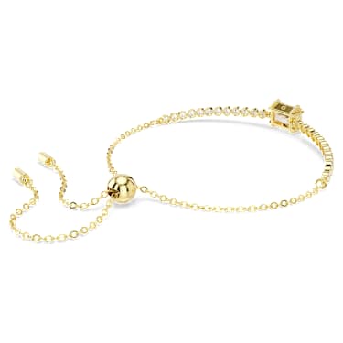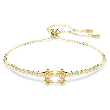 This classic Tennis bracelet adds a touch of radiance to any look. Fastened with a sliding closure for an adjustable fit, the gold-tone plated design features a uniform row of Zirconia and is accented with a baguette-cut caramel Zirconia at its center. A vibrant twist on a timeless style that you can wear time and time again.