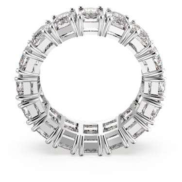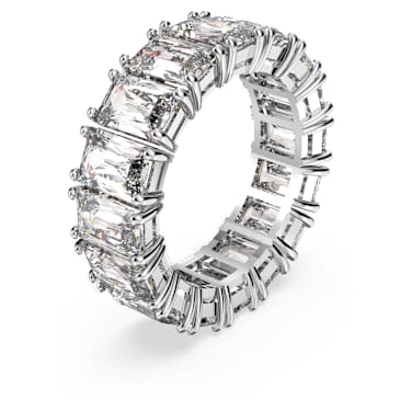 A striking, elegant look distinguishes this ring. A row of gleaming white stones, cut into a faceted, rectangular shape, lends it an air of refined simplicity. The unbroken line of sparkling stones defines the character of the design and matches well with equally elegant pieces of jewelry, especially other rings to create an attractive and on-trend stacking look. A great match for special occasions, and an inspired gift giving idea.