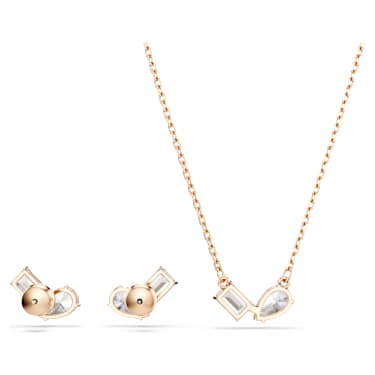 Create a look of overall elegance with this matching Mesmera pendant and earrings set. The eye-catching pieces are rose gold-tone plated and each feature a pair of prong-set Zirconia in pear and octagon-step cuts. Simple yet refined, this set makes a perfect gift for any special occasion.