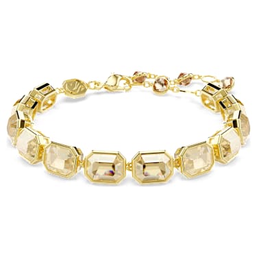 Be your brilliant best in this vivid Millenia bracelet. The gold-tone plated design features a strand of octagonal caramel crystals in a refined bezel setting. There is also a lobster closure with an elongation, allowing you to adjust the fit. Pair this bracelet with the matching necklace to elevate your everyday look.